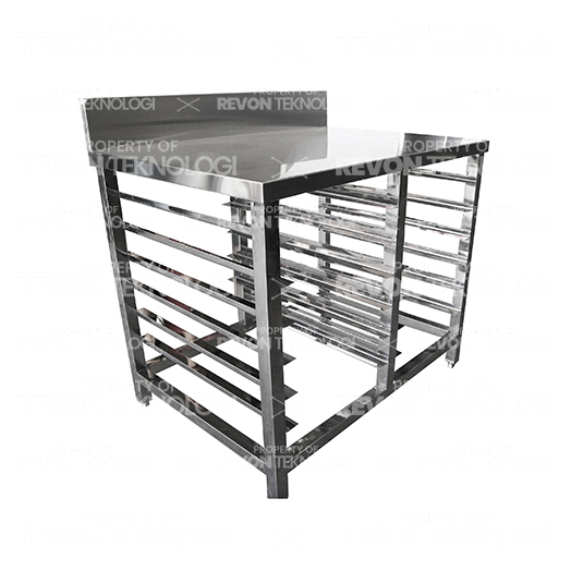 Jika pada meja dough stainles steel hanya digunakan untuk proses membentuk adonan dan memukul adonan, maka meja stainless steel for bakery ini adalah jenis meja dapur dengan desain khusus yang dilengkapi rak loyang, fungsinya untuk meja kerja dapur bakery.