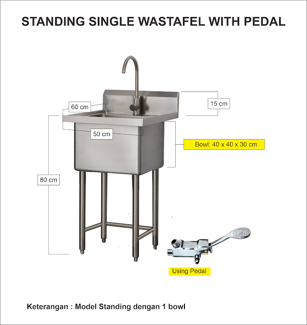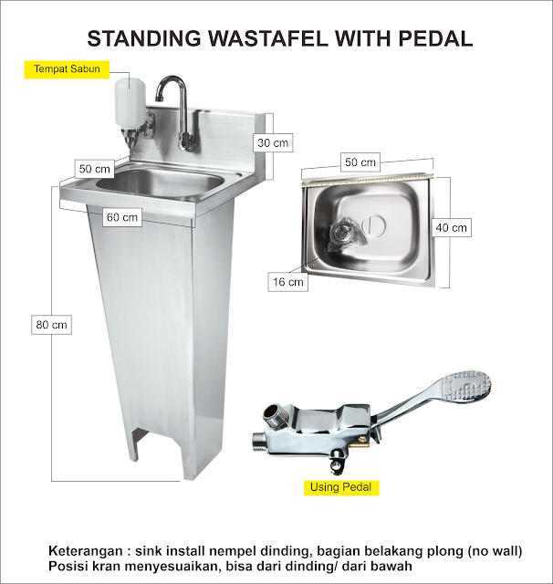 Tempat cuci tangan portable yang kedua dinamakan ‘standing single wastafel’. Dimensi dari wastafel ini kurang lebih sama dengan versi sebelumnya yakni 80 x 50 x 60 cm plus 15 cm (backsplash). Yang membedakan adalah adanya empat buah kaki dari bahan pipa stainless. Kaki stainless ini dapat diatur ketinggianya untuk menyesuaikan kontur lantai yakni dengan cara memutar ujuang kakinya dengan tangan. Dengan toleransi mencapai 5 cm maka tak ada lagi cerita meja goyang.